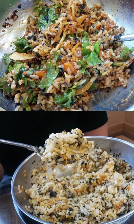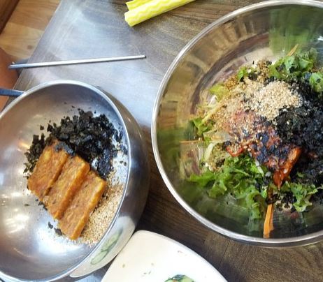 위 사진에서 좌측은 멍게비빔밥이고 우측이 멍게고추장비빔밥입니다. 네모블록으로 살짝 얼려져 참기름과 깨소금, 김가루랑 같이 공깃밥에 쓱쓱 비벼 먹는 음식이에요. 고추장이랑 채소가 더 추가된 멍게고추장비빔밥도 식욕을 돋워주는 비주얼이었습니다.