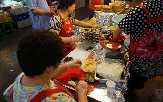 그리고 빈대떡을 만드는 옆에서는 마약김밥이 생산되고 있었습니다. 광장시장의 마약김밥도 꽤 유명하기 때문에 저도 한 번 먹어보려고 주문했습니다.