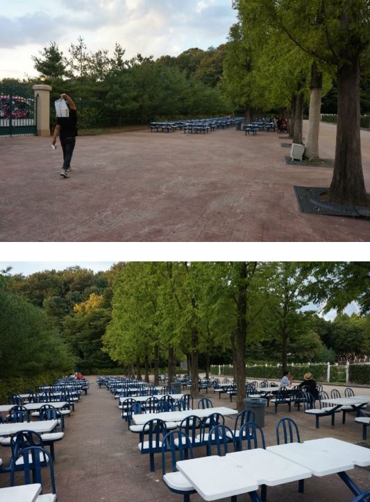장미정원을 끝까지 와서 계단을 따라 올라가면 에버랜드 피크닉존을 찾을 수 있습니다. 따로 명시된 표지판은 없었다는 게 아쉬웠고 덩그러니 테이블만 놓여있는 모습도 조금 놀라웠습니다. 그래도 공간이 있는 게 어디냐며 앉아서 먹기로 했습니다.